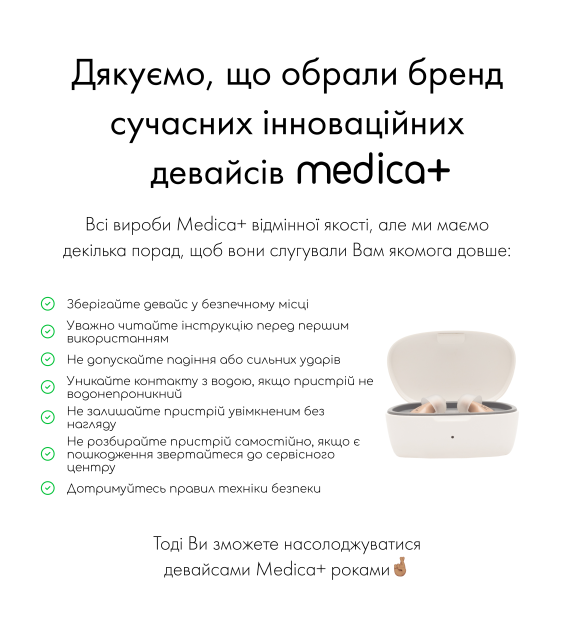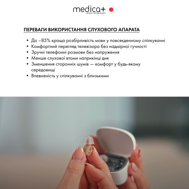 Сучасні технології, що використовуються в моделі, забезпечують плавний перехід між високими та низькими тонами. Перегляд телевізора, прослуховування улюбленої музики, розмова з близькими та друзями — усе це буде комфортним зі слуховим апаратом MEDICA+ SOUND CONTROL 16.