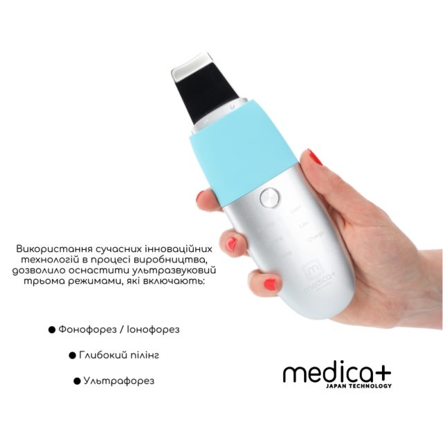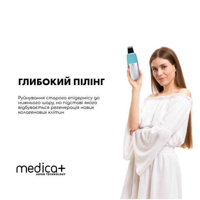 У набір входить ультразвуковий скрабер MEDICA+ Vibroskin 8.0, спеціально розроблений компанією MEDICA+ Гідратуючий гель (100 мл) для розм’якшення шкіри перед процедурою та Заспокійлива маска MEDICA+ (50 мл) для догляду після чищення. Усі засоби взаємодіють в комплексі, забезпечуючи професійний результат очищення без подразнення, пігментації чи відчуття сухості.