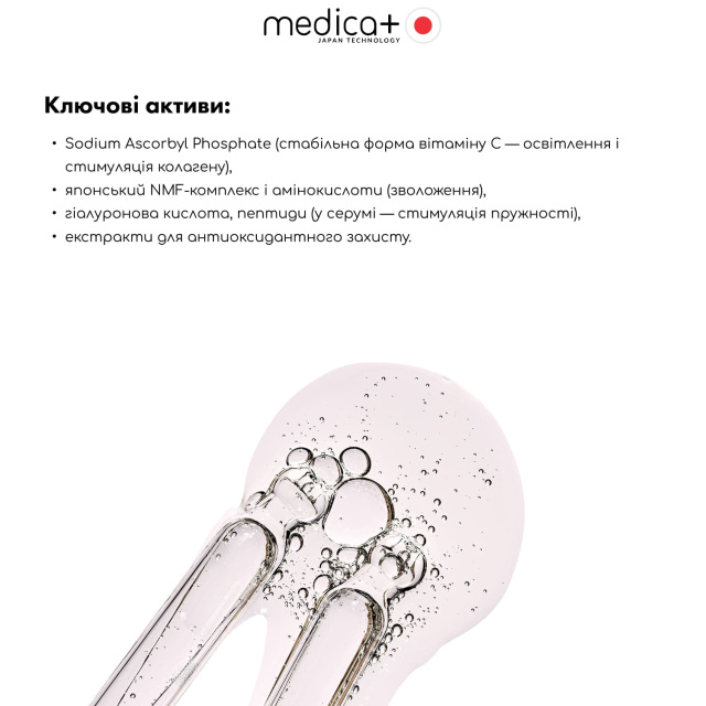 Набір підходить для всіх типів шкіри, особливо — для тьмяної, втомленої та з нерівним тоном. Формули розроблені дерматологами MEDICA+, не містять парабенів і силіконів, мають збалансований pH та легку текстуру, яка швидко вбирається.